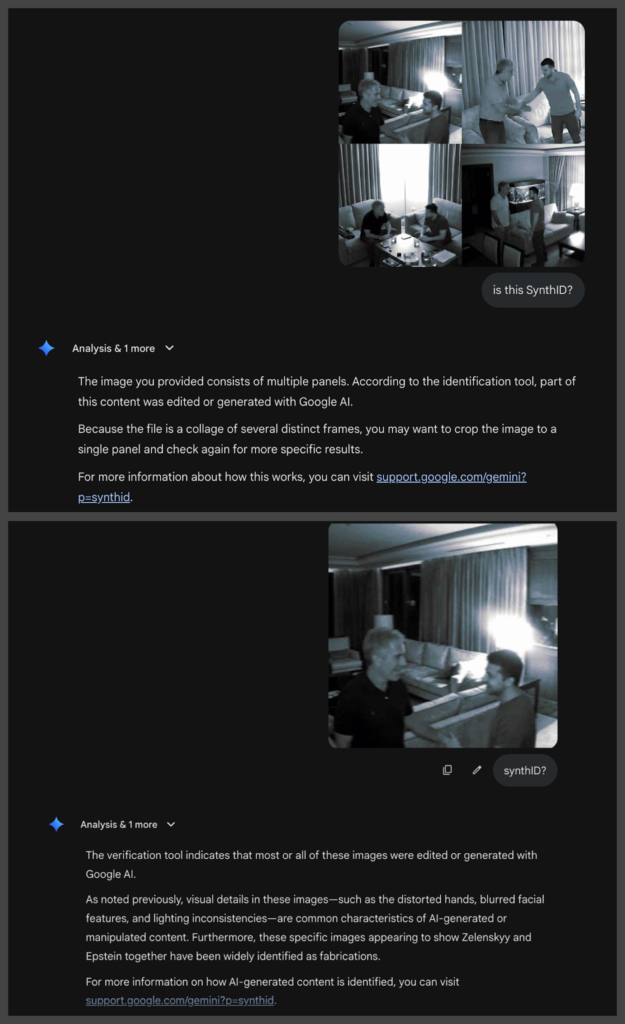 There is no verified evidence that any genuine security camera footage exists showing Volodymyr Zelensky at Epstein’s properties. Moreover, Gemini flagged the images as likely AI-generated, noting the presence of digital watermarking patterns such as SynthID, suggesting a high probability that AI was used.