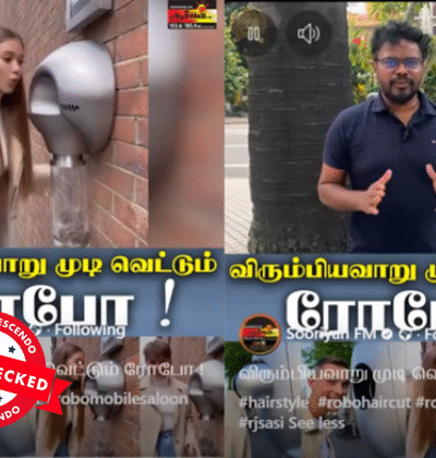 INTRO :சில வினாடிகளில் விரும்பும் ஸ்டைலில் முடி வெட்டும் ரோபோ இயந்திரம் என சமூகவலைத்தளங்களில் ஒரு காணொளி பகிரப்பட்டு வருகின்றமை காணக்கிடைத்தது. குறித்த தகவலின் உண்மைத்தன்மையினை கண்டறிவதற்கு நாம் தேடுதலில் ஈடுபட்ட வேளையில் குறித்த தகவல் போலியானது என ஃபேக்ட்கிரஸண்டோ நிறுவனம் கண்டறிந்துள்ளது. தகவலின்விவரம் (What is the claim): Facebook Link | Archived Link Facebook Link | Archived Link சமூகவலைத்தளங்களில்“ சில வினாடிகளில் விரும்பும் ஸ்டைலில் முடி வெட்டும் ரோபோ இயந்திரம் […]