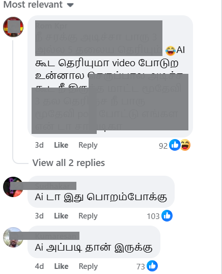 நாம் குறித்த காணொளியின் கமென்ட்களை பார்த்த போது அதில் பலர் இது செயற்கை நுண்ணறிவு தொழிநுட்பத்தினால் உருவாக்கப்பட்ட காணொளி என கமெண்ட் செய்திருந்தமையை காணமுடிந்தது.
