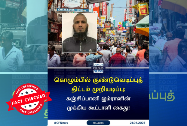 Subscribe to our WhatsApp Channel INTRO : கொழும்பில் குண்டு வெடிப்புத் திட்டம் தீட்டிய நபர் கைது என சமூகவலைத்தளங்களில் ஒரு செய்தி பகிரப்பட்டு வருகின்றமை காணக்கிடைத்தது. எனவே குறித்த புகைப்படம் தொடர்பில் உண்மையை அறிய ஃபேக்ட் கிரஸண்டோ நிறுவனம் ஆய்வொன்றை மேற்கொண்டது. தகவலின்விவரம் (What is the claim): facebook Link  |  Archived Link சமூகவலைத்தளங்களில் “ 🛑 BREAKING NEWS #கொழும்பில்_குண்டு #வெடிப்பு_திட்டம் #முறியடிப்பு_கஞ்சிப் #பானை_இம்ரனின் #முக்கிய_கூட்டாளி_கைது 21 Apr 2026 […]