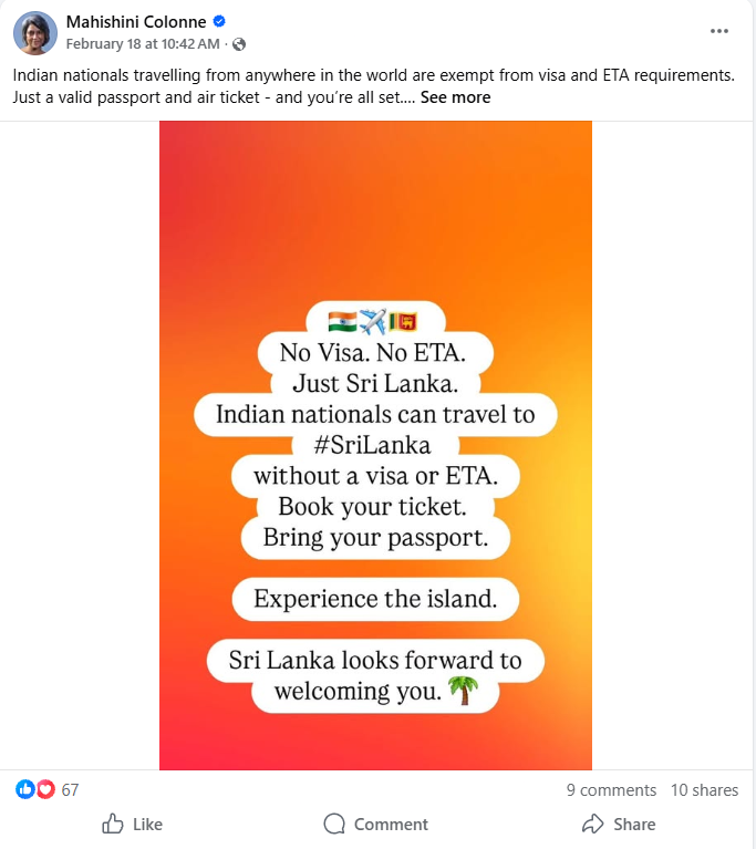 குறித்த பதிவில் விசா தேவையில்லை. ETA தேவையில்லை. இலங்கைக்கு வரவேற்கிறோம்!