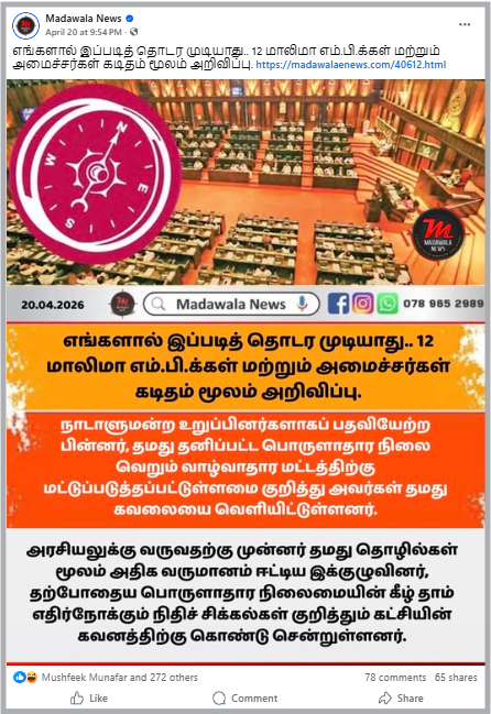 எங்களால் இப்படித் தொடர முடியாது.. 12 மாலிமா எம்.பி.க்கள் மற்றும் அமைச்சர்கள் கடிதம் மூலம் அறிவிப்பு. என தெரிவித்து குறித்த பதிவானது 2026.04.20 ஆம் பதிவேற்றம் செய்யப்பட்டுள்ளது.