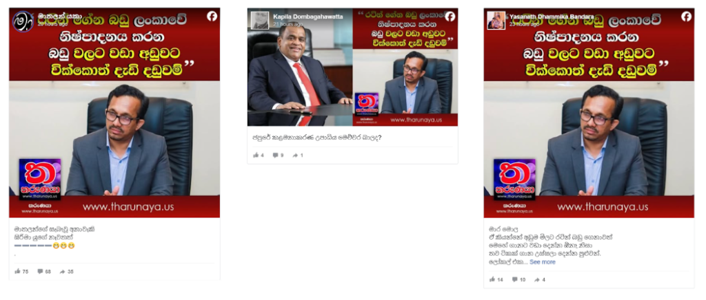 அதேபோன்று, மேற்கூறிய பதிவில் பயன்படுத்தப்பட்டிருந்த புகைப்படங்கள் மற்றும் ‘நாட்டிற்கு இறக்குமதி செய்யப்படும் பொருட்கள் இலங்கையில் உற்பத்தி செய்யப்படும் பொருட்களை விடக் குறைந்த விலையில் விற்பனை செய்யப்பட்டால் கடும் தண்டனை’ எனும் தலைப்பைப் பயன்படுத்தி, கேலிக்கை ரீதியிலான பதிவுகள் பலவும் பின்வருமாறு உருவாக்கப்பட்டிருந்தன.