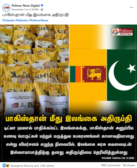 தித்வா’ புயல் காரணமாக நாட்டில் ஏற்பட்ட பாரிய அனர்த்தங்களில் சிக்கி பாதிப்படைந்த மக்களுக்கு வழங்கிய நன்கொடையில் காலாவதியாகிய உணவுகளை இலங்கைக்கு பாகிஸ்தான் வழங்கிதாக ஒரு பதிவு சமூகவலைத்தளங்களில் பகிரப்பட்டு வருகின்றமை காணக்கிடைத்தது.