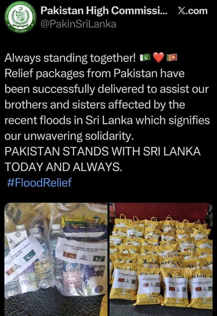 இதேபோல், கடந்த மாதம் 29 ஆம் திகதி (29.11.2025), பாதிக்கப்பட்டவர்களுக்கு ஆதரவாக கொழும்பு துறைமுகத்தில் நங்கூரமிட்டிருந்த பாகிஸ்தான் கப்பலான PNS SAIF இலிருந்து, நன்கொடையாக வழங்கப்பட்ட பொருட்களை இலங்கை கடற்படையினருக்கு கையளித்த புகைப்படங்கள் இலங்கையில் உள்ள பாகிஸ்தான் உயர் ஸ்தானிகராலயத்தின் அதிகாரப்பூர்வ பேஸ்புக் பக்கத்தில் வெளியிடப்பட்டிருந்தமையும் காணக்கிடைத்தது.