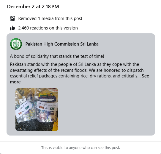 மேலும் இலங்கையில் உள்ள பாகிஸ்தான் உயர் ஸ்தானிகராலயத்தின் அதிகாரப்பூர்வ பேஸ்புக் பக்கத்திலும் இது தொடர்பான புகைப்படங்களுடன் ஒரு பதிவை வெளியிட்டது, அதில் நிவாரணப் பொதியில் அரிசி, உலர் உணவுப் பொருட்கள் மற்றும் அத்தியாவசியப் பொருட்கள் உள்ளடங்கியுள்ளன என்று அதில் குறிப்பிடப்பட்டுள்ளது.