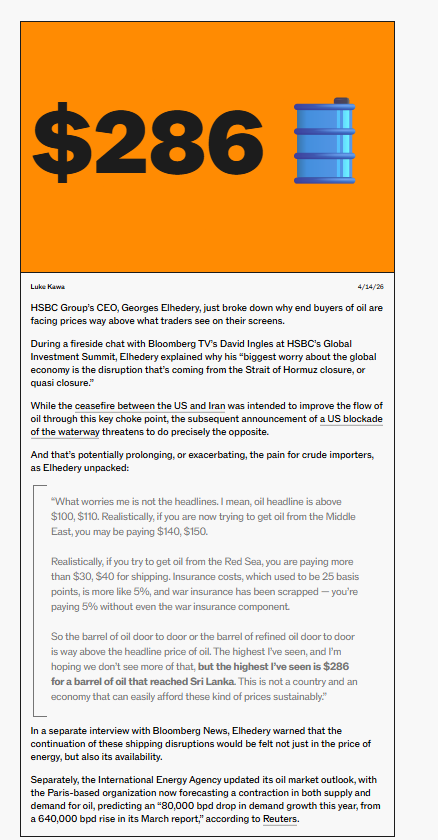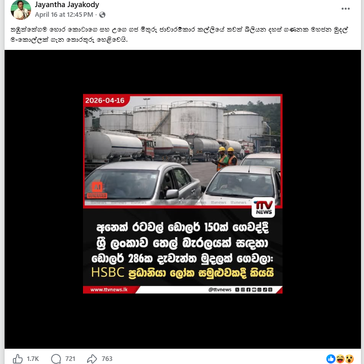 சமூகவலைத்தளங்களில் “மற்ற நாடுகள் ஒரு பேரல் எண்ணெய்க்கு 150 டாலர் செலுத்திய நிலையில், இலங்கை 286 டாலர் செலுத்தியதாக HSBC தலைவர் ஒரு சர்வதேச மாநாட்டில் தெரிவித்துள்ளார் “என இம் மாதம் 16 ஆம் திகதி 2026 ஆம் ஆண்டு (16.04.2026) பதிவேற்றம் செய்யப்பட்டிருந்தது.
