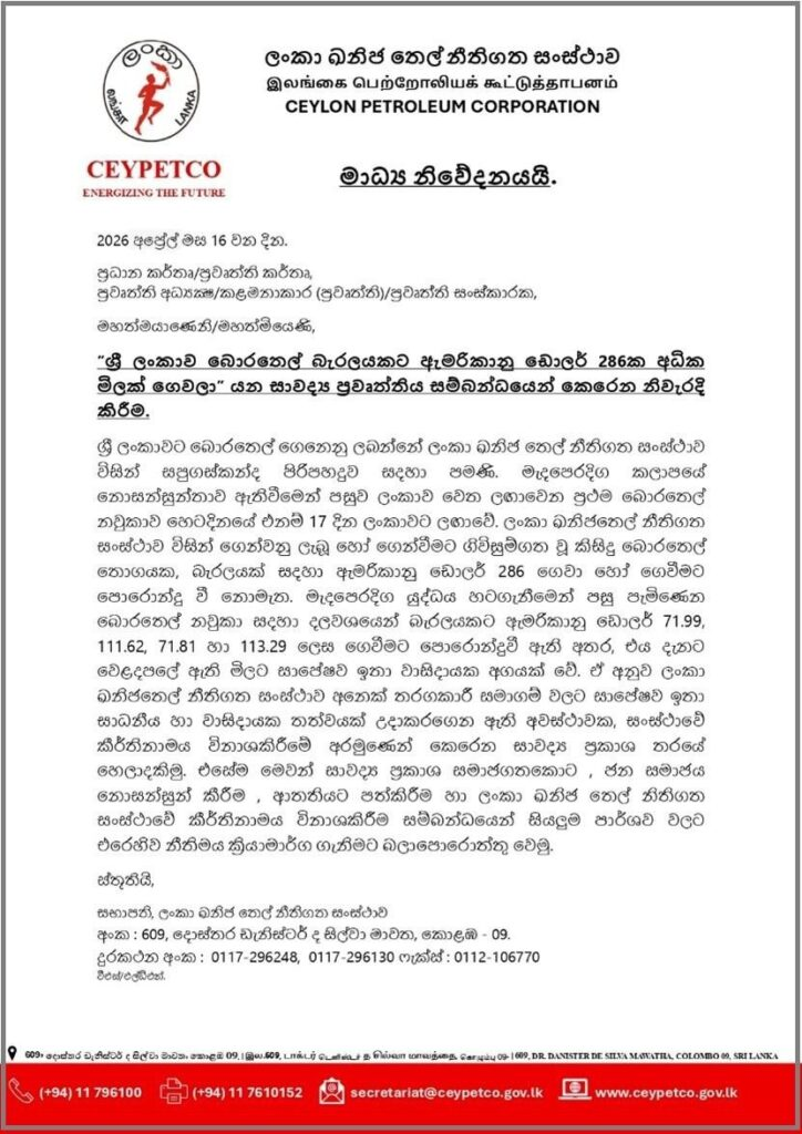 மேலும், இலங்கை பெட்ரோலியக் கூட்டுத்தாபனத்தின் தலைவர் ஜனக ராஜகருண, எண்ணெய் கூட்டுத்தாபனம் ஒரு பீப்பாய் கச்சா எண்ணெயை 286 டொலருக்கு வாங்கியதாகக் கூறப்படும் செய்திகள் முற்றிலும் பொய்யானவை என்று ஏப்ரல் 16 அன்று ஒரு சிறப்பு அறிக்கையை வெளியிட்டிருந்தார்.