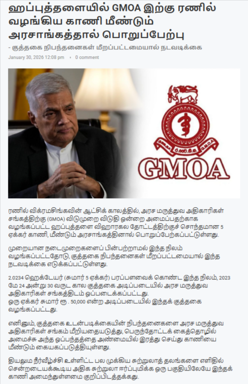 மேலும் நாம் GMOA இற்கு வழங்கிய காணி தொடர்பாக நாம் மேற்கொண்ட தேடலின் போது, கடந்த மாதம் 30 ஆம் திகதி (30.01.2026) வெளியாகியிருந்த செய்தி அறிக்கையொன்று எமக்கு கிடைக்கப்பெற்றது.