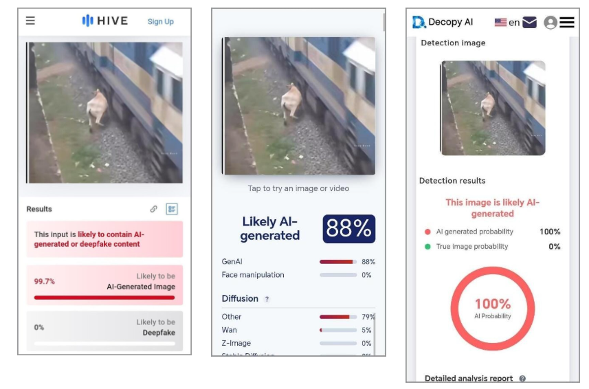 நாம் மேற்கொண்ட ஆய்வின் அடிப்படையில்ரயில் கடவைக்கு அருகில் இருந்த சிறுமியை காப்பாற்றிய பசு என பரவும் காணொளி செயற்கை நுண்ணறிவை பயன்படுத்தி உருவாக்கப்பட்டது என கண்டறியப்பட்டது.