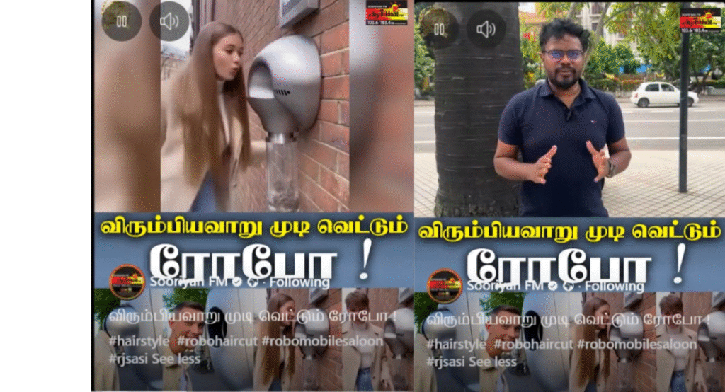 சில வினாடிகளில் விரும்பும் ஸ்டைலில் முடி வெட்டும் ரோபோ இயந்திரம் என சமூகவலைத்தளங்களில் ஒரு காணொளி பகிரப்பட்டு வருகின்றமை காணக்கிடைத்தது.