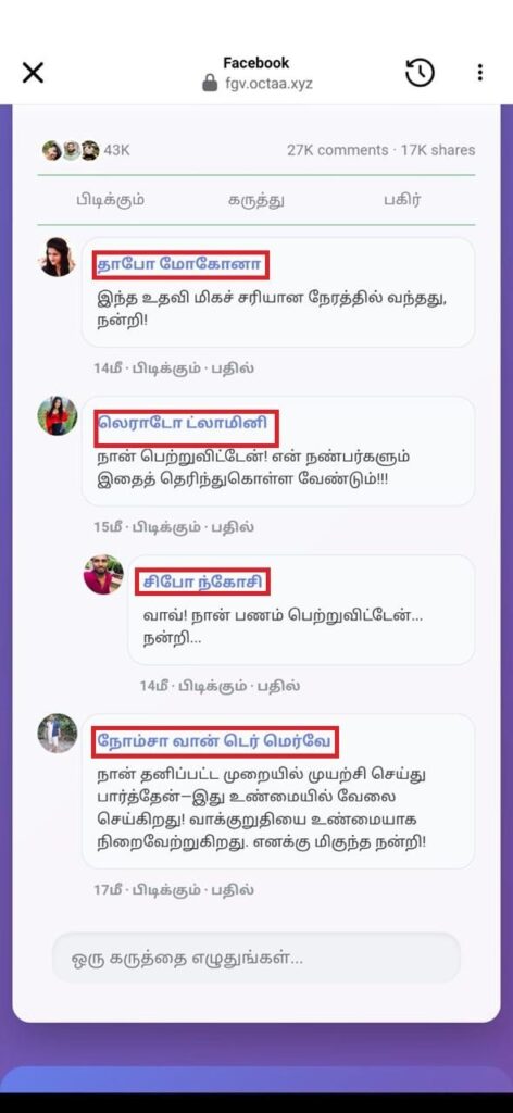 மேலும் இந்த தொகையானது கிடைக்கப்பெற்றதாக தெரிவித்து சிலர் கமென்ட் செய்துள்ளதாகவும் பகிரப்பட்டுள்ளது, அதனை நாம் அவதானிக்கு போது கமென்ட் செய்தவர்களின் பெயர்கள் போலியாக உருவாக்கப்பட்டுள்ளதனையும் அறியமுடிகின்றது.