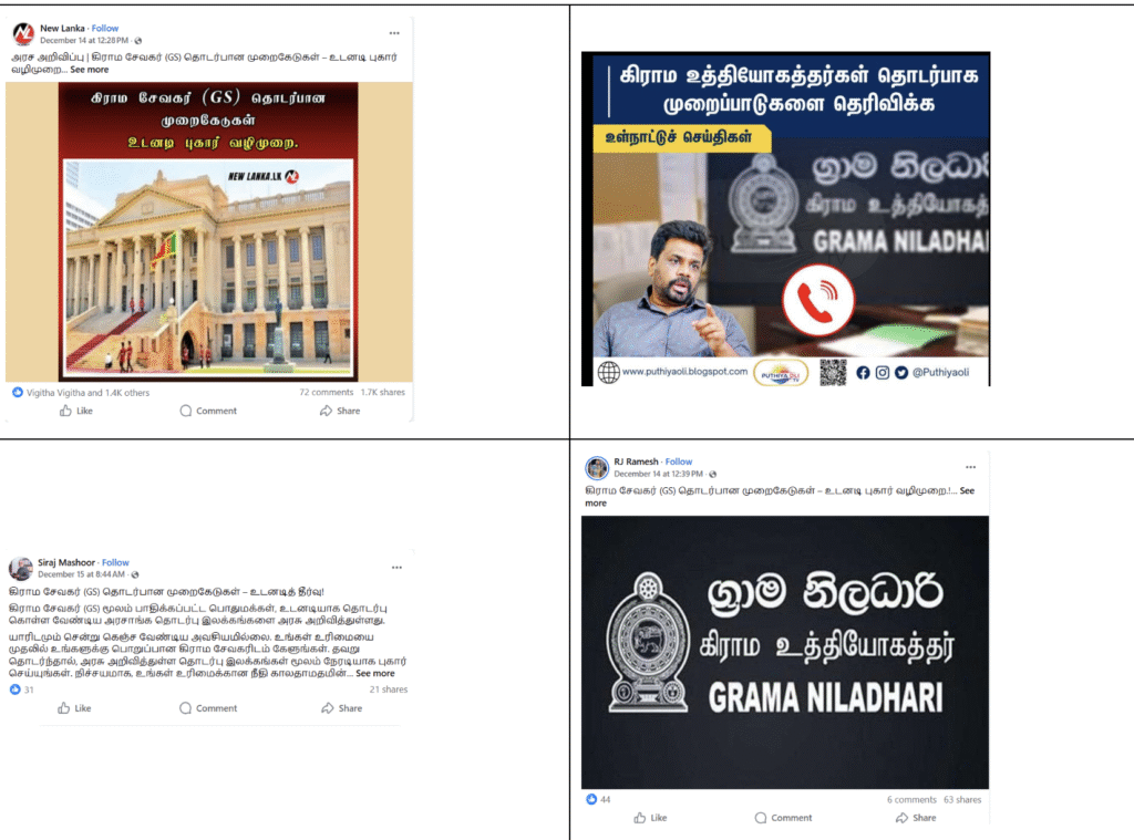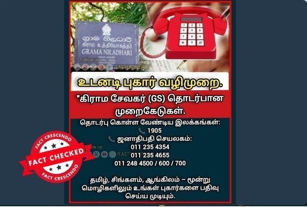 Title:“கிராம சேவகர்கள் தொடர்பில் முறைப்பாடுகளை அறிவிக்க உடனடி புகார் வழிமுறை” என பகிரப்படும் தகவல் போலியானது!