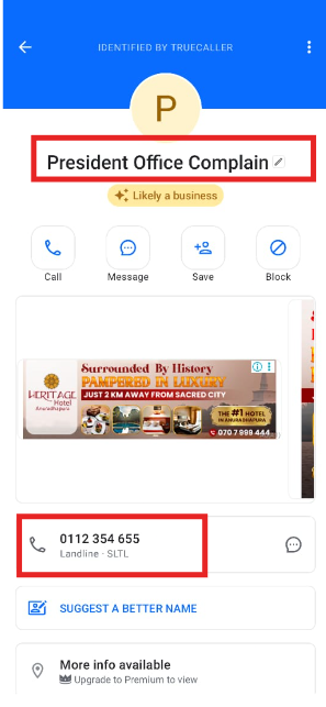 இரண்டாவதாக வழங்கப்பட்ட 011 235 4655 இலக்கம் தொடர்பில் Truecaller ஊடாக ஆராய்ந்த போது அந்த இலக்கமானது President Office Complaint  என குறிப்பிடப்பட்டிருந்தது.