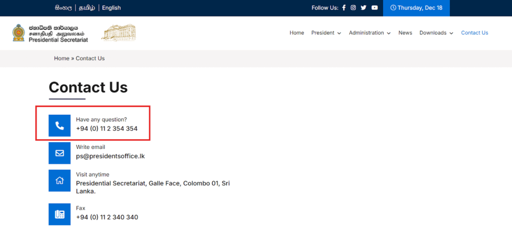 📞 ஜனாதிபதி செயலகம்: