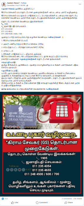 அதில் ‘கிராம சேவகர்கள் தொடர்பான முறைகேடுகளை துரிதமாக முறையிட நடைமுறை’ என்ற தலைப்பில், ஜனாதிபதி அலுவலகத்தினால் அறிவிக்கப்பட்டதாக போலி அவசர தொலைபேசி இலக்கமும் நேரடி இலக்கங்களும் சமூக ஊடகங்களில் பரப்பப்படுகிறது. இந்தச் செய்தி போலியானது என்று ஜனாதிபதி அலுவலகம் அறிவிக்கிறது என குறிப்பிடப்பட்டிருந்தது.