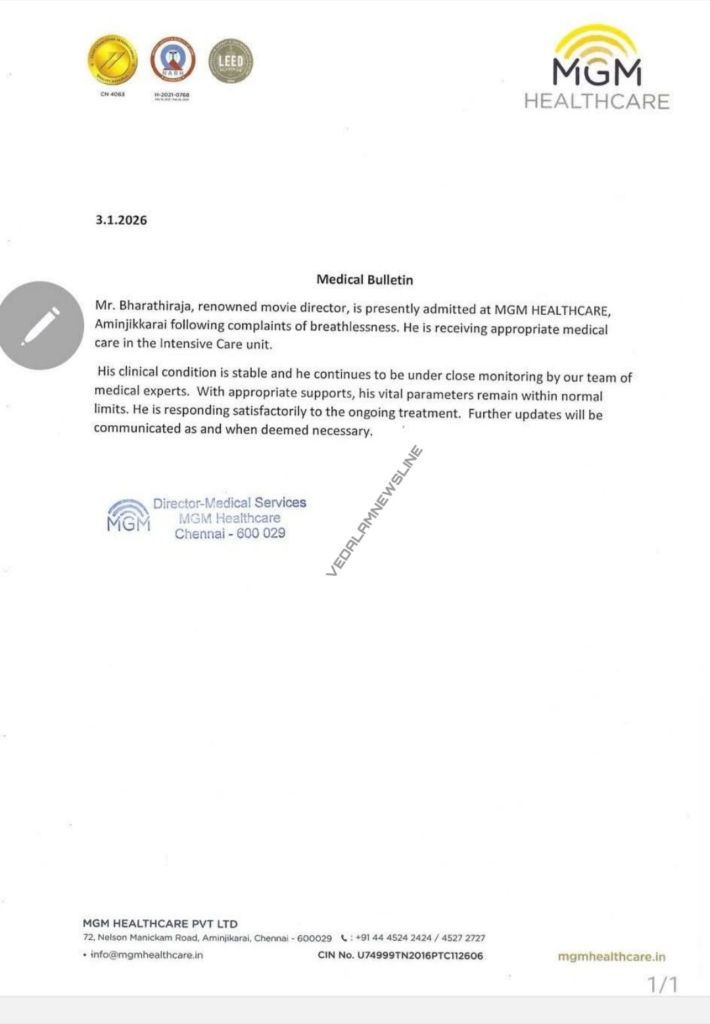 மேலும், மருத்துவமனை நிர்வாகம் வெளியிட்ட அறிக்கையில், “தகுந்த மருத்துவ ஆதரவுடன், அவரது உடல்நிலை அளவீடுகள் (Vital parameters) சாதாரண நிலையில் உள்ளன. பாரதிராஜாவுக்கு அளிக்கப்படும் சிகிச்சைக்கு நல்ல முறையில் அவர் ஒத்துழைக்கிறார்” என்று குறிப்பிடப்பட்டுள்ளது.