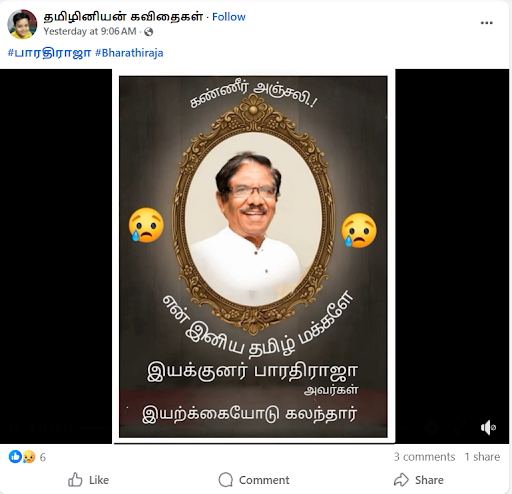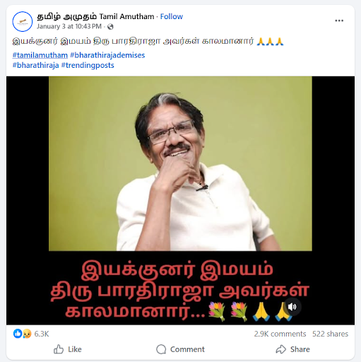 இயக்குனர் சிகரம் பாரதிராஜா காலமானதாக தெரிவித்து பல பதிவுகள் சமூக ஊடகங்களில் பகிரப்பட்டு வருகின்றமையை காணமுடிந்தது.