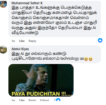 அதே சந்தர்ப்பத்தில் இந்த காணொளி தொடர்பில் கமென்ட் செய்திருந்தவர்களும் இது செயற்கை நுண்ணறிவு தொழிநுட்பத்தினால் உருவாக்கப்பட்ட காணொளி என்பதனை குறிப்பிட்டிருந்தனர்.