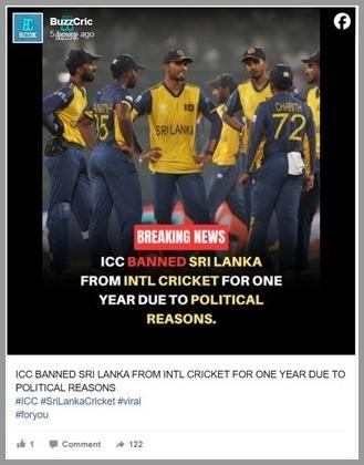 அரசியல் காரணங்களால் சர்வதேச கிரிக்கெட் சபையினால் (ICC) இலங்கை கிரிக்கெட் அணிக்கு சர்வதேச கிரிக்கெட் தடைவிதிக்கப்பட்டதாக சமூக ஊடகங்களில் பல பதிவுகள் பகிரப்பட்டிருந்தன.
