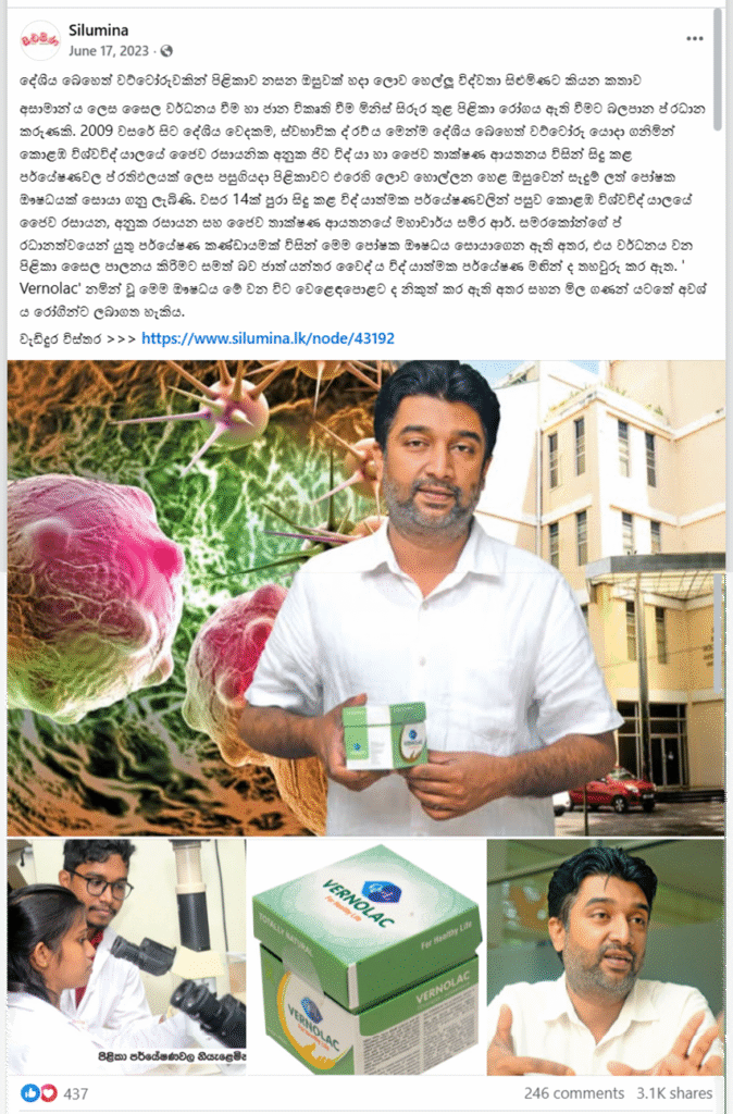 மேலும்,சில சிங்களமொழி ஊடகங்களில், இந்த மருந்தானது, புற்றுநோய் செல்களின் வளர்ச்சியைக் கட்டுப்படுத்தும் திறன் கொண்டது என்பதை சர்வதேச மருத்துவ ஆராய்ச்சி உறுதிப்படுத்தியுள்ளது என்றும், ‘ Vernolac’ என்று அழைக்கப்படும் இந்த மருந்து இப்போது சந்தையில் வெளியிடப்பட்டுள்ளது என்றும், தேவைப்படும் நோயாளிகளுக்கு மானிய விலையில் கிடைக்கிறது என்றும் தெரிவிக்கப்பட்டிருந்தது.