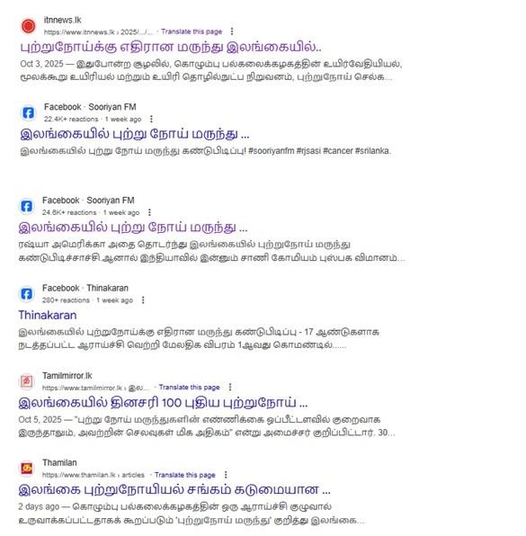 இலங்கையில் புற்றுநோய் செல்களைக் கொல்லும் மருந்து கண்டுபிடிப்பு என தெரிவிக்கப்பட்டு குறித்த பதிவு 2025.10.03 ஆம் திகதி பதிவேற்றம் செய்யப்பட்டிருந்தது.