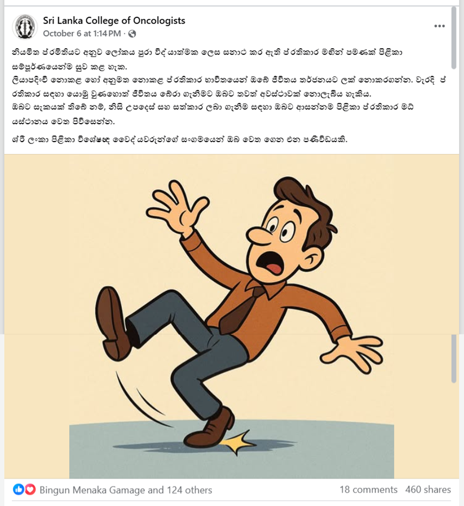 இது இலங்கை புற்றுநோயியல் நிபுணர்கள் சங்கத்தின் செய்தி என தெரவித்து, இலங்கை புற்றுநோயியல் கல்லூரியும் இது தொடர்பான பதிவொன்றை தமது உத்தியோகபூர்வ பேஸ்புக் பக்கத்தில் வெளியிட்டிருந்தது.