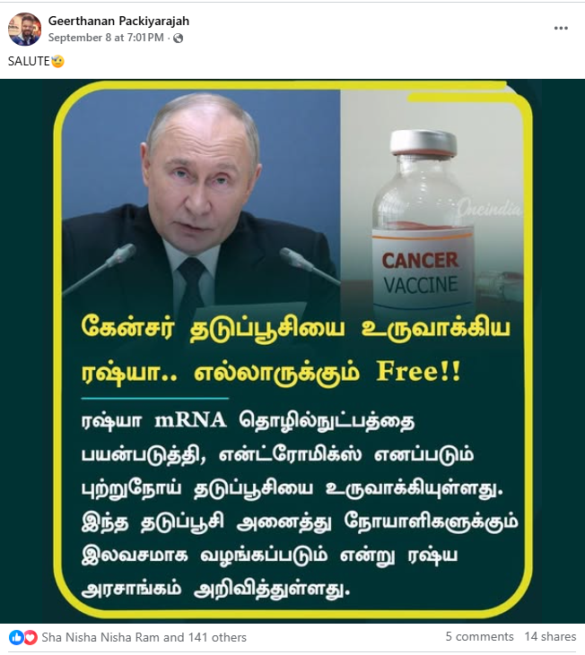மேலும் 2024 ஆம் ஆண்டு இந்த தடுப்பூசி குறித்து ஒரு அறிக்கை வெளியிடப்பட்டது, அதன் பின்னர் இந்த தடுப்பூசி குறித்து ஜனாதிபதி எந்த அறிக்கையும் வெளியிட்டதாக எந்தவொரு அதிகாரப்பூர்வ ஆதாரங்களும் இல்லை. இருப்பினும், நோயாளிகளுக்கு தடுப்பூசி இலவசமாக வழங்கப்படும் என்று ரஷ்ய சுகாதார அதிகாரிகள் அவ்வப்போது அறிக்கைகளை வெளியிட்டிருந்தாலும், இவை இறுதி முடிவுகள் என்றோ அல்லது உலகெங்கிலும் உள்ள நோயாளிகளுக்கு இந்த தடுப்பூசி இலவசமாக விநியோகிக்கப்படும் என்றோ தெரிவிக்கப்பட்டமைக்கான எந்த ஆதாரங்களும் இல்லை என்பதுவும் குறிப்பிடத்தக்கது.எனவே வாசகர்களே, இது போன்ற தவறான செய்திகள், புகைப்படங்கள் மற்றும் வீடியோக்களை உறுதிசெய்யாமல் மற்றவர்களுக்குப் பகிரவேண்டாம்.