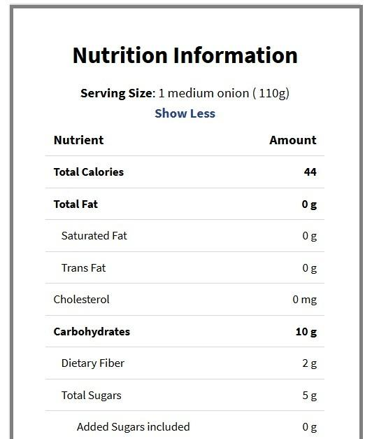அமெரிக்க விவசாய திணைக்களத்தின் (USDA) தகவலின்படி, 110 கிராம் எடையுள்ள நடுத்தர அளவிலான ஒரு வெங்காயத்தில் உள்ள ஊட்டச்சத்து கூறுகள் பின்வருமாறு