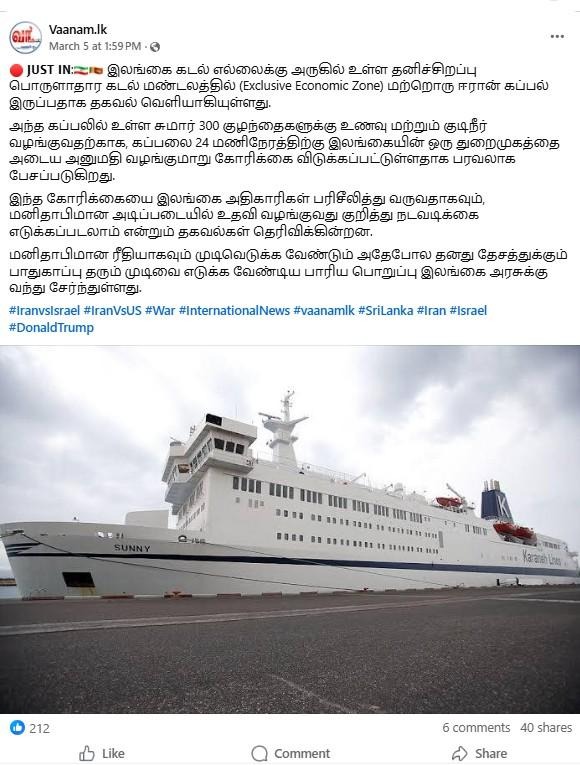 இலங்கை கடல் எல்லைக்கு அருகில் உள்ள தனிச்சிறப்பு பொருளாதார கடல் மண்டலத்திற்குள் வந்த மற்றுமொரு ஈரான் கப்பலில் 300 குழந்தைகள் இருப்பதாக தெரிவித்து சமூக ஊடகஙடகளில் பல தகவல்கள் பகிரப்பட்டு வந்தமையை காணமுடிந்தது.