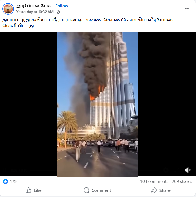 அதனை மையமாகக் கொண்டு பல்வேறு தகவல்கள் சமூக ஊடகங்களில் பகிரப்பட்டுவரும் நிலையில்,துபாயில் அமைந்துள்ள உலகின் மிக உயரமான கட்டிடமான புர்ஜ் கலீஃபா மீது 1,800 ஏவுகணைகள் ஏவப்பட்டதாக தெரிவிக்கப்பட்டு காணொளியொன்று சமூக வலைத்தளங்களில் பகிரப்பட்டு வருகின்றமையை காணமுடிந்தது.
