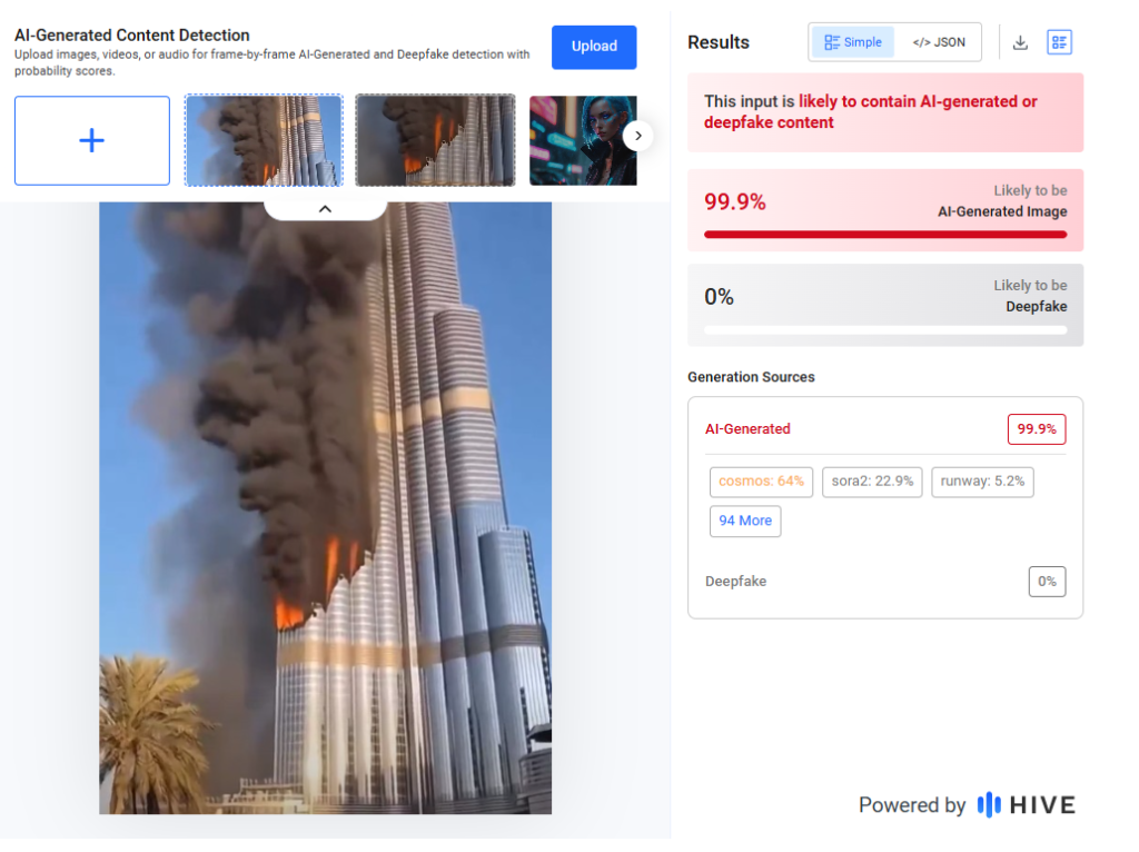 ஆகவே குறித்த காணொயியை நன்கு அவதானிக்கும் போது அதில் காணப்பட்ட செயற்கை தன்மையினை தொடர்ந்து நாம் குறித்த காணொளியை AI Detective Tool ஐ பயன்படுத்தி ஆய்வு செய்த போது குறித்த காணொளியானது செயற்கை நுண்ணறிவு தொழிநுட்பத்தினால் உருவாக்கப்பட்டுள்ளமை கண்டறியப்பட்டது.