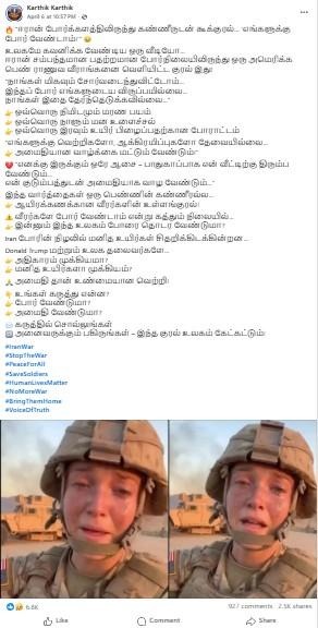 ஈரான் போர்களத்திலிருந்து ‘எங்களுக்கு போர் வேண்டாம்’ என அமெரிக்க பெண் இராணுவ வீராங்கனை அழும் காணொளி மற்றும் புகைப்படம் தற்போது சமூக ஊடகங்களில் பகிரப்பட்டு வருவதனை காணமுடிந்தது.