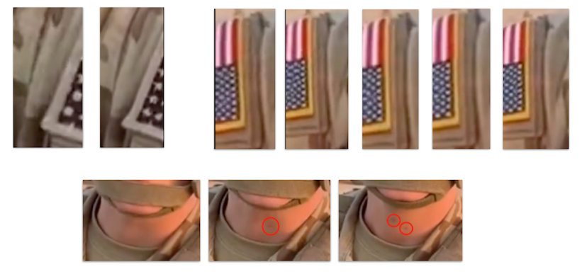 அவரின் உடையிலுள்ள கொடி, பதக்கங்களில் உள்ள நட்சத்திர வடிவங்களின் எண்ணிக்கை மற்றும் திசை என்பன மாறிக்கொண்டிருப்பதை அவதானிக்கலாம். மேலும், அவரின் கழுத்தில் இருக்கும் மச்சம் போன்ற ஒரு அடையாளம் காணொளி முழுவதும் மறைந்து மீண்டும் தோன்றுகின்றது.