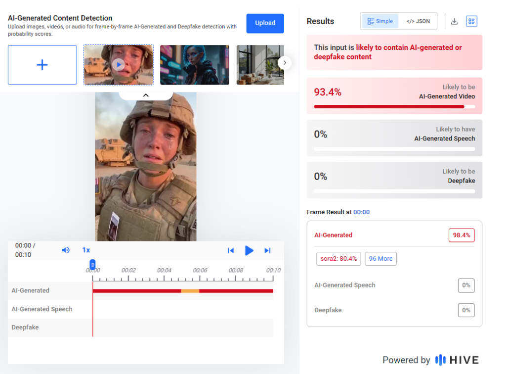 எனவே எமது ஆய்வின் அடிப்படையில் “போர் வேண்டாம்“ என அமெரிக்க பெண் இராணுவ வீராங்கனை போர்களத்திலிருந்து அழுவதாக பகிரப்பட்ட காணொளி மற்றும் புகைப்படம் தவறானது என்பதுடன் அது செயற்கை நுண்ணறிவு தொழிநுட்பத்தினால் உருவாக்கப்பட்டுள்ளமையும் கண்டறியப்பட்டுள்ளது.