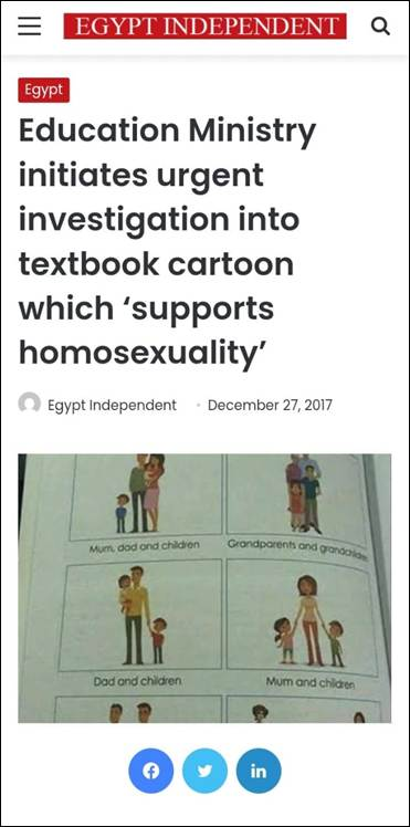 ஓரினச்சேர்க்கைக்கு ஆதரவு வழங்குவதாகக் கூறப்படும் இந்தப் பாடப்புத்தகத்தின் குறித்த பக்கம் தொடர்பாக, 2017 ஆம் ஆண்டில் எகிப்து கல்வி அமைச்சு அவசர விசாரணை ஒன்றை ஆரம்பித்ததாக அந்நாட்டு ஊடகங்கள் செய்தி வெளியிட்டிருந்தன.