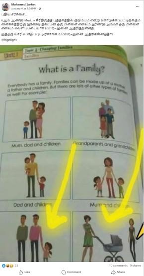 புதிய கல்வி சீர்திருத்தங்கள் மற்றும் பாடசாலை பாடத்திட்டங்களின் உள்ளடக்கங்கள் தொடர்பில் தொடர்ந்து சர்ச்சையான விவாதங்கள் நடைபெற்று வரும் இக்காலகட்டத்தில், தற்போது 6ஆம் தர ஆங்கில பாடநூலில் குடும்பம் என்று கொடுக்கப்பட்டிருக்கும் விளக்கம் தொடர்பில் சர்ச்சைக்குரிய பல தகவல்கள் சமூக ஊடகங்களில் பகிரப்பட்டு வருகின்றமையை காணமுடிந்தது.