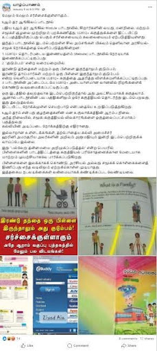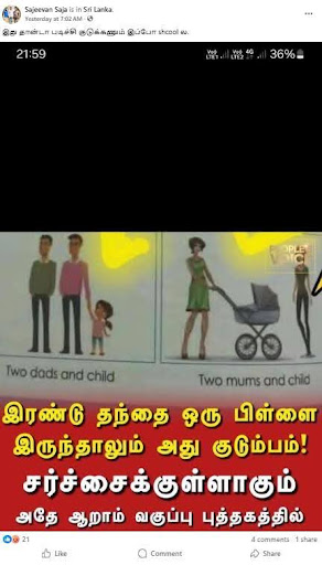 குறித்த பதிவில் புதிய சர்ச்சை….6ஆம் ஆண்டு Module சீர்திருத்த புத்தகத்தில் குடும்பம் என்று கொடுக்கப்பட்டிருக்கும் விளக்கத்திற்கு இரண்டு தகப்பன் ஒரு பிள்ளை எனவும் இரண்டு அம்மா ஒரு பிள்ளை எனவும் வெளிப்படையாக LGBTQ+ இனை ஆதரித்துள்ளது.