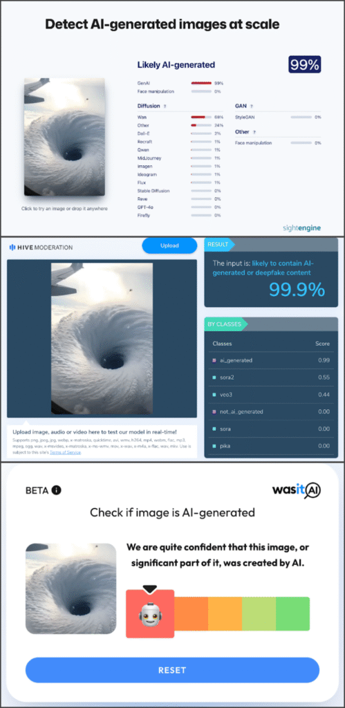 மேற்குறிப்பிட்ட காணொளியை நாம் நன்கு அவதானித்தால்,இந்தக் காட்சிகள், சூறாவளியின் மையப் பகுதிக்கு (hurricane’s eye) மேலே ஒரு விமானம் பறப்பதையே காட்டுகிறது, அது மேகங்களின் சமச்சீர், ஆழமான “புனல்” வழியாகக் கீழ் நோக்கி காட்டப்படுகின்றது, இது உண்மையான சூறாவளிகள் எவ்வாறு தோன்றும் என்பதற்குப் நேர்மாறாக இருப்பதனை அறியமுடிகின்றது.