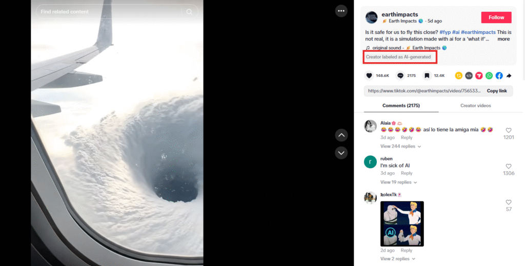 குறித்த காணொளி தொடர்பான உண்மையை அறிய அந்த காணொளியின் சில காட்சிகளை புகைப்படமாக மாற்றி நாம் தேடுதலில் ஈடுபட்டபோது, @earthimpacts என்ற டிக்டொக் பக்கத்தில் குறித்த காணொளியானது 5 நாட்களுக்கு முன்னர் (2025.10.26) பதிவேற்றம் செய்யப்பட்டிருந்தமையை அவதானிக்க முடிந்தது.