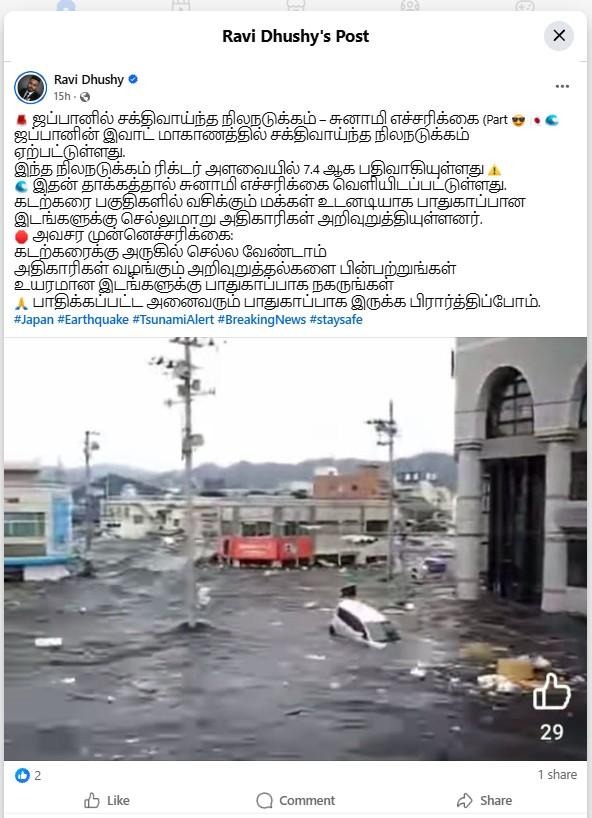 ஜப்பானின் தற்போதை நிலநடுக்கத்தின் போது எடுக்கப்பட்டதாக பகிரப்படும் புகைப்படம்2011 ஆம் ஆண்டு ஜப்பானில் ஏற்பட்ட சுனாமியின் போது எடுக்கப்பட்ட காணொளியின் காட்சி