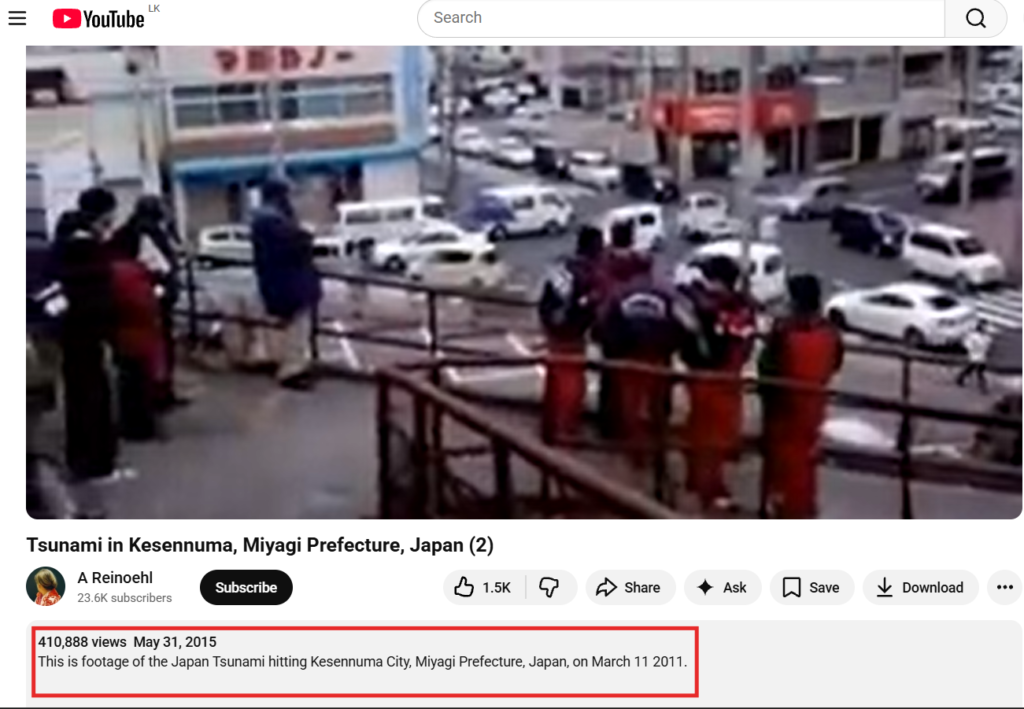 மேற்குறிப்பிட்ட காணொளி 2015 ஆம் ஆண்டு Youtube தளத்தில் பதிவேற்றப்பட்டிருந்தாலும் காணொளியின் விளக்கக் குறிப்பில் இந்த காணொளியானது  2011 ஆம் ஆண்டு  மார்ச் 11 அன்று ஜப்பானின் மியாகி மாகாணத்தில் உள்ள கெசென்னுமா நகரை சுனாமி தாக்கிய போது எடுக்கப்பட்ட காட்சியாகும். என  தெரிவிக்கப்பட்டிருந்தமை குறிப்பிடத்தக்கது.