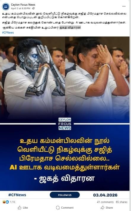 கம்மன்பிலவின் புத்தக வெளியீட்டிற்கு சஜித் போகவில்லை?”’ அது AI படம்! – நளின் பண்டார. என தெரிவிக்கப்பட்டு குறித்த பதிவானது, 2026.04.02 ஆம் திகதி பதிவேற்றம் செய்யப்பட்டுள்ளது.