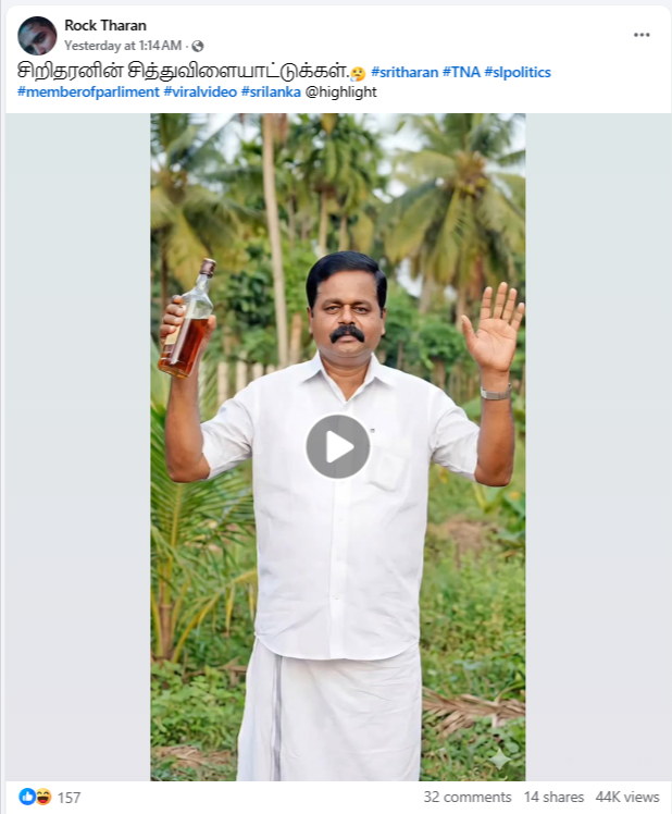 பாராளுமன்ற உறுப்பினரான சிறிதரன் கையில் மது போத்தலுடன் இருப்பது போன்ற ஒரு காணொளி பதிவு சமூகவலைத்தளங்களில் பகிரப்பட்டு வருகின்றமை காணக்கிடைத்தது.