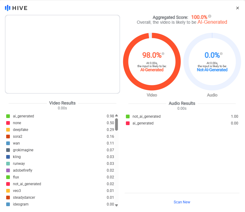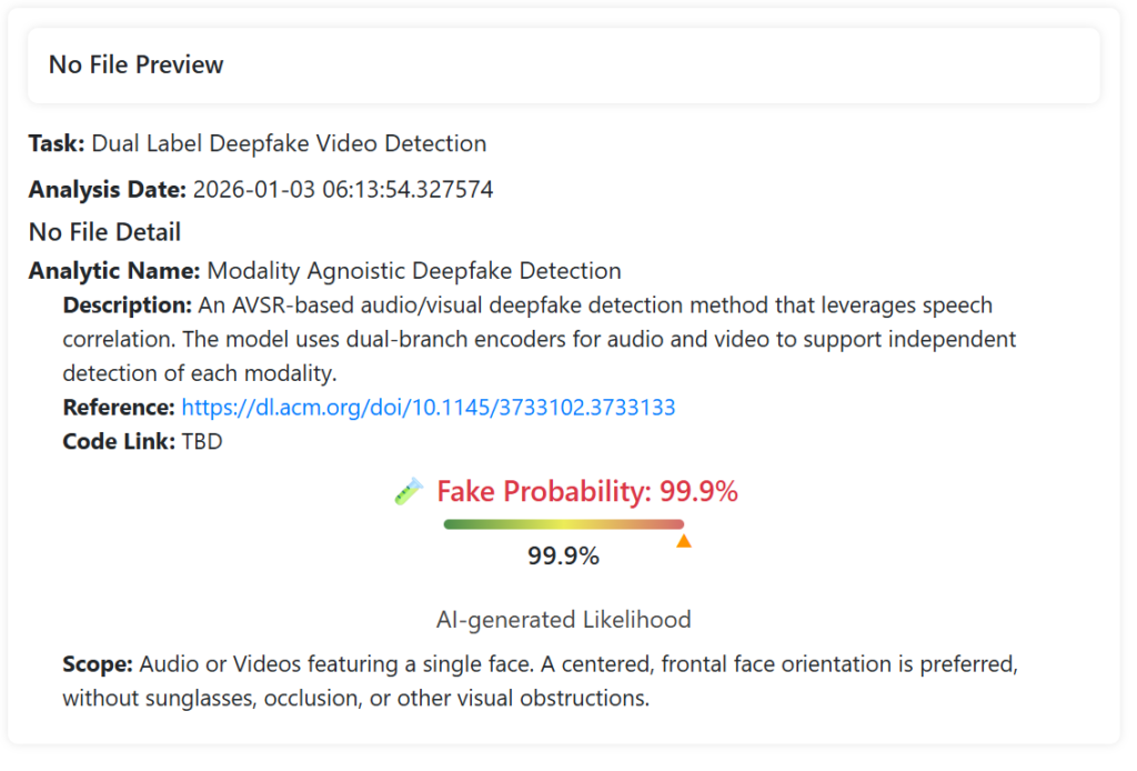 அதனடிப்படையில் நாம் Hive மற்றும் DeepFake-O-Meter போன்ற செயற்கை நுண்ணறிவை கண்டறியும் கருவிகளை பயன்படுத்தி மேற்கொண்ட ஆய்வில் குறித்த காணொளி செயற்கை நுண்ணறிவை பயன்படுத்தி உருவாக்கியுள்ளமை கண்டறியப்பட்டது.