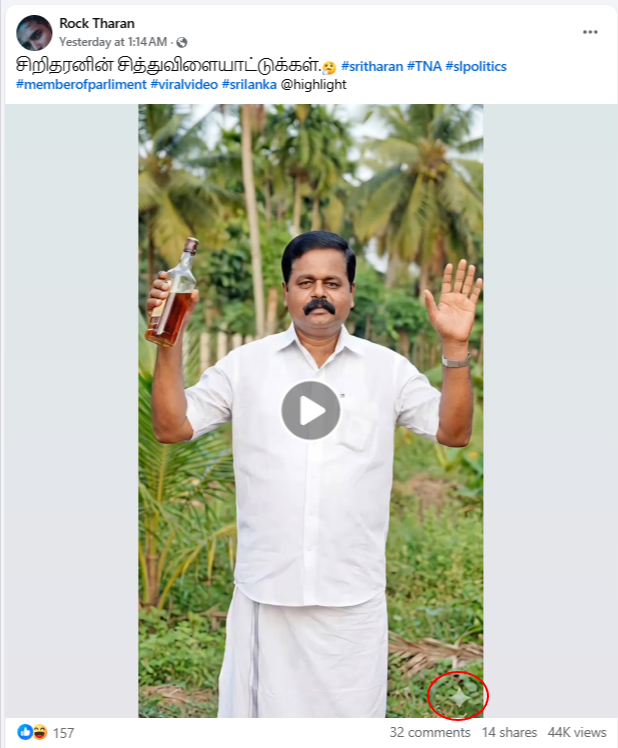 நாம் மேற்கொண்ட ஆய்வின் அடிப்படையில் பாராளுமன்ற உறுப்பினர் சிறிதரன் கையில் மது போத்தலுடன் தனக்கு வாக்களிக்க வேண்டாம் என பரவும் காணொளி செயற்கை நுண்ணறிவை பயன்படுத்தி