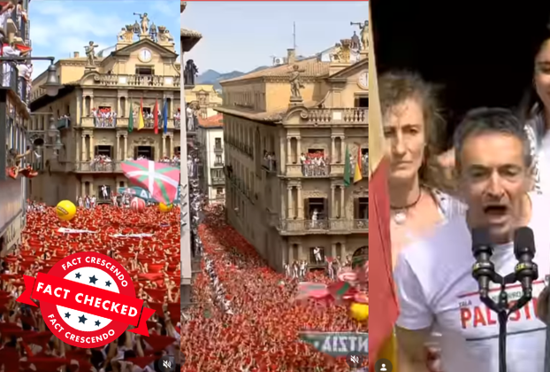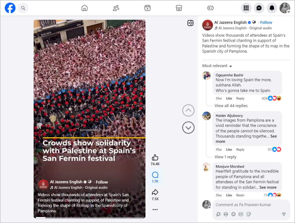 அதில், “ஸ்பெயினின் பம்ப்ளோனா நகரில் நடைபெற்ற சான் பெர்மின் (San Fermin festival) விழாவில் பங்கேற்ற ஆயிரக்கணக்கானோர் சுதந்திர பாலஸ்தீனம் கோரி முழக்கமிட்டனர்” என்று குறிப்பிடப்பட்டிருந்தது.