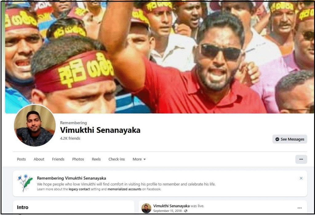 தொடர்புடைய சமூக ஊடகப் பதிவுகளுக்குப் பயன்படுத்திய இளைஞர் 7 ஆண்டுகளுக்கு முன்பு ஒரு வாகன விபத்தில் இறந்துவிட்டதாகவும் குறிப்பிடப்பட்டிருந்தது. அதன்படி, விமுக்தி சேனநாயக்கவின் பேஸ்புக் கணக்கை நாம் ஆராய்ந்த போது, அவரது கணக்கு 2018 முதல் புதுப்பிக்கப்படவில்லை என்பதுவும், அது Memorialized Account ஆக மாற்றப்பட்டுள்ளது என்பதுவும் தெளிவாகியது. இருப்பினும், அவரது கணக்கைச் சரிபார்த்தபோது, அவர் இலங்கை பொதுஜன பெரமுனவின் ஆதரவாளர் என்பதனையும் அறியமுடிந்தது.