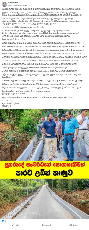 கீழே காட்டப்படுவது, சம்பந்தப்பட்ட புகைப்படங்களை மீண்டும் திருத்தி, “தற்போது அபிவிருத்தி செய்யப்பட்டு வரும் வீதி” என குறிப்பிடும் வகையில், அமைச்சரின் பேஸ்புக் பதிவை புதுப்பித்திருந்த விதமாகும்.