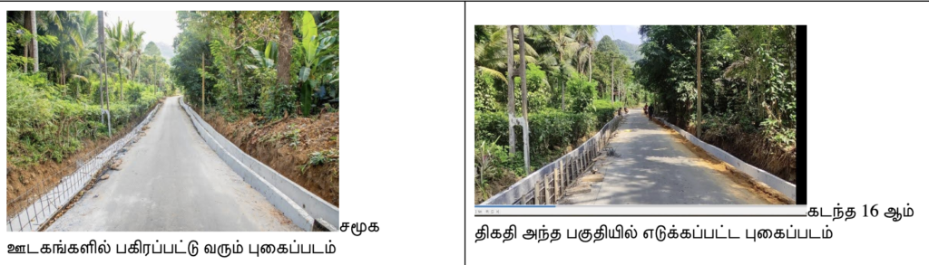 சமூக ஊடகங்களில் வெளியிடப்பட்ட புகைப்படத்தில் வீதி மற்றும் வடிகால் (கால்வாய்) அமைக்கப்பட்ட பகுதிகளுக்கு இடையில் உள்ள இடைவெளியானது, ஜனவரி 16 ஆம் திகதி ஆய்வின் போது மணல் நிரப்பி மூடிய நிலையில் காணப்பட்டது.